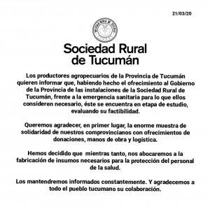 Los productores agropecuarios de la Provincia de Tucumán quieren informar que, habiendo hecho el ofrecimiento al Gobierno de la Provincia de las instalaciones de la Sociedad Rural de Tucumán, frente a la emergencia sanitaria para lo que ellos consideren necesario, éste se encuentra en etapa de estudio, evaluando su factibilidad.