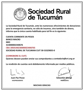 La Sociedad Rural de Tucumán, ante los numerosos ofrecimientos de donaciones para la emergencia sanitaria, no sólo de insumos, sino también de dinero, informa que la única cuenta habilitada para tal fin es la siguiente: