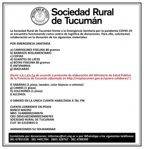 La Sociedad Rural de Tucumán frente a la Emergencia Sanitaria por la pandemia COVID-19 se encuentra funcionando como centro de logística de donaciones. Para ello, solicitamos colaboración en la donación de los siguientes materiales: